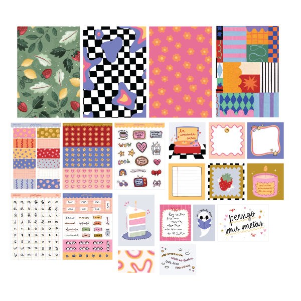 - 5 planchas de stickers troquelados en vinilo resistente al agua: Abecedario, Días de la semana, Números, Dibujos y simil-washis.
